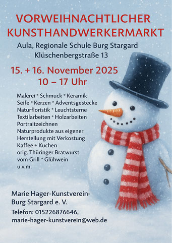 Die Adventszeit naht – und was gibt es Schöneres, als sich mit handgemachten Schätzen, festlichem Kunsthandwerk und kulinarischen Genüssen darauf einzustimmen? Am 15. und 16. November 2025, jeweils von 10 bis 17 Uhr, öffnet der vorweihnachtliche Kunsthandwerkermarkt in der Aula der Regionalen Schule Burg Stargard (Klüschenbergstraße 13) seine Türen. Veranstaltet wird er vom Marie Hager-Kunstverein Burg Stargard e. V.